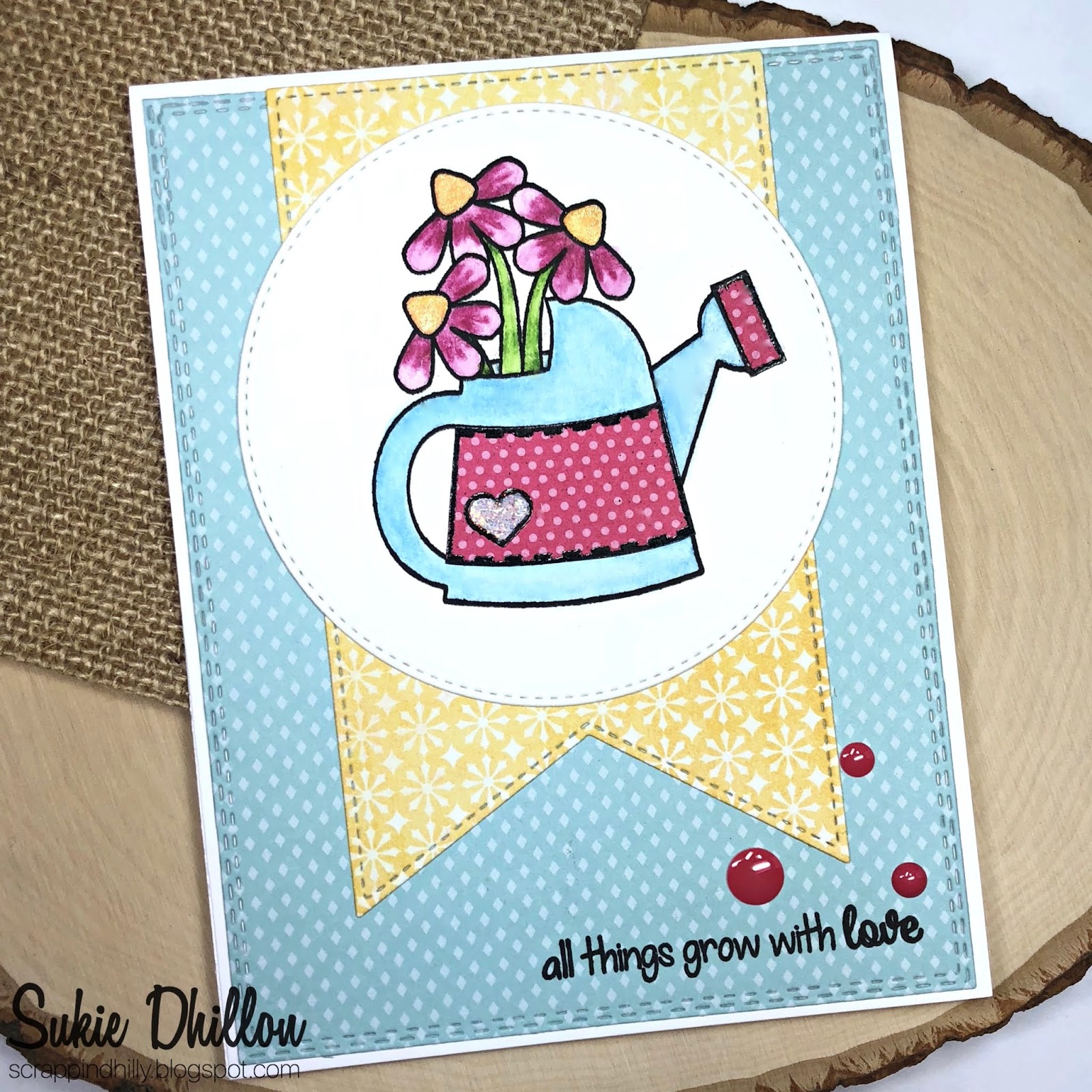 I added each piece of the banner to the wooden frame using a clothespin. The die cut hearts were added to the bottom clothesline of the frame. A couple of kraft paper flowers were used to embellish the hearts.