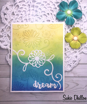 Hello! For this card, I colored my background with several Distress Oxide Ink colors blending them to create an additional layer of color. Next, I embossed the colored background with the Momenta Floral Cut & Emboss set.