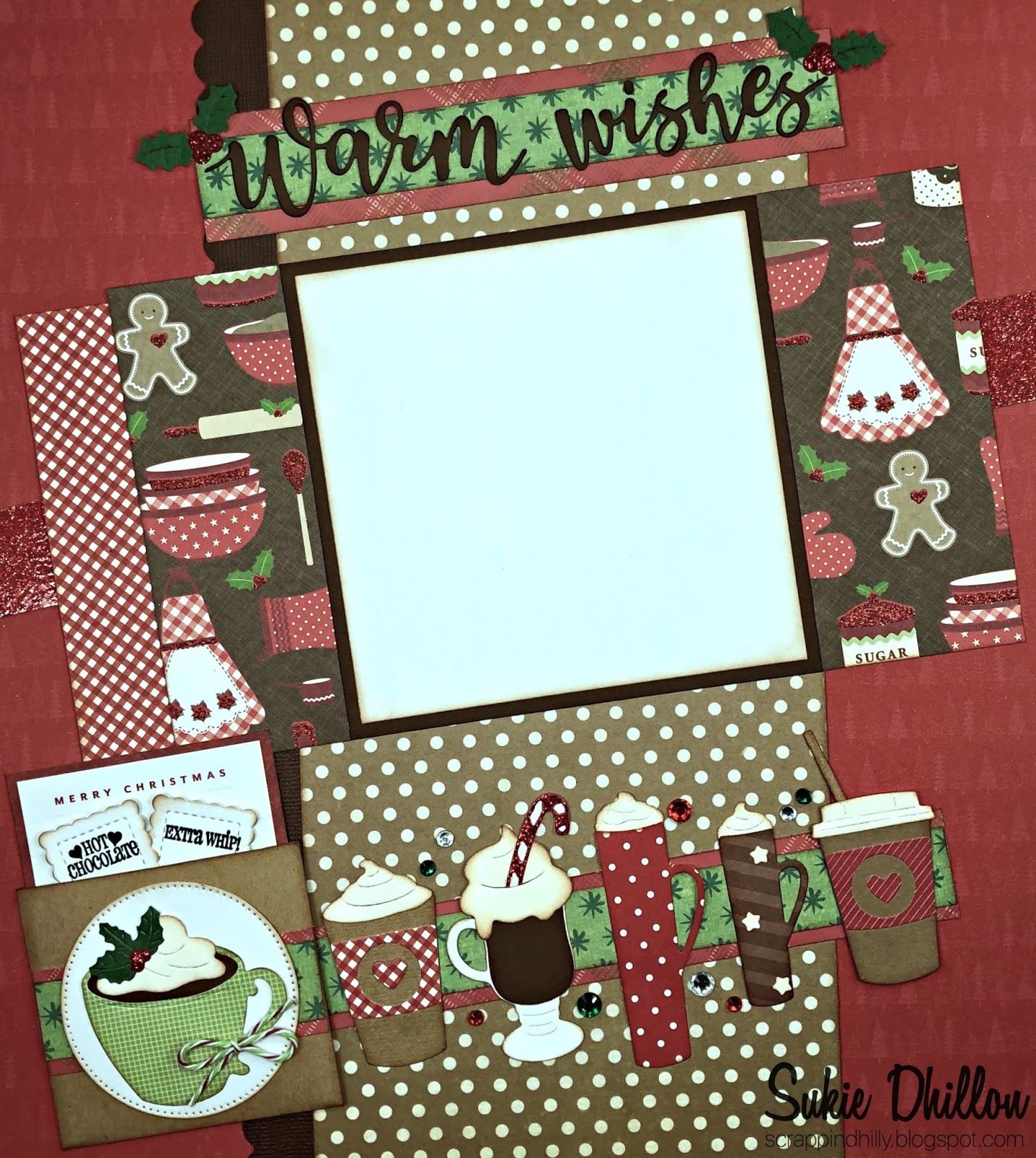 The patterned paper was the inspiration for the die cut cuts on my layout page. I cut all of the drinks from the Cottage Cutz Coffee & Cocoa Warm Wishes and Sweet Christmas die sets. Everything was inked on the edges for added dimension. The mug from the Sweet Christmas set was layered on top of a circle cut from the Pierced Circle set.