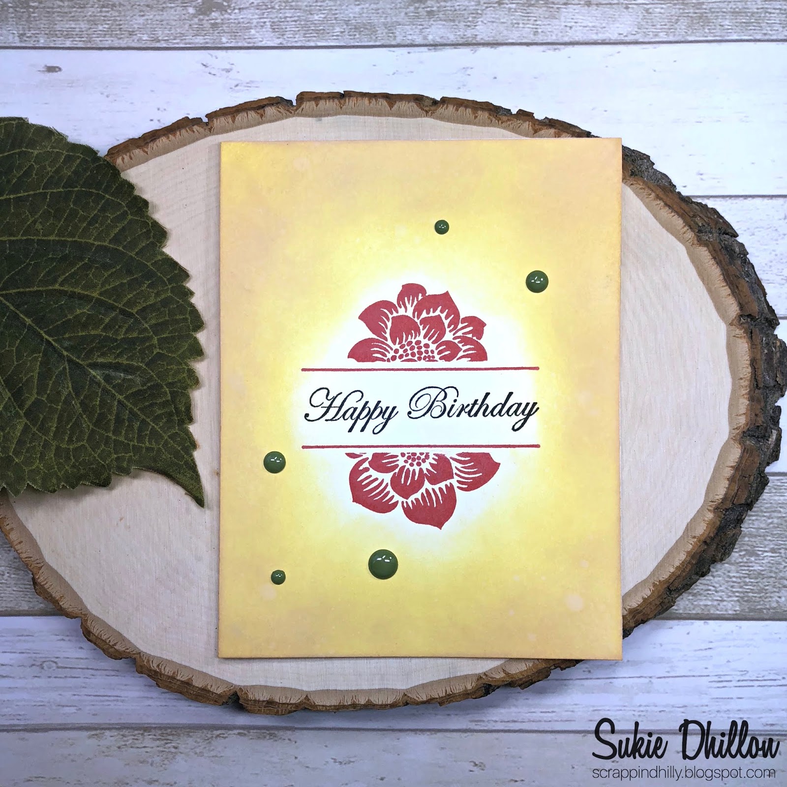 The floral image was stamped with the Fired Brick Oxide Ink and a basic black ink for the sentiment so it would pop on my card. A few enamel dots were the finishing accent on my card.