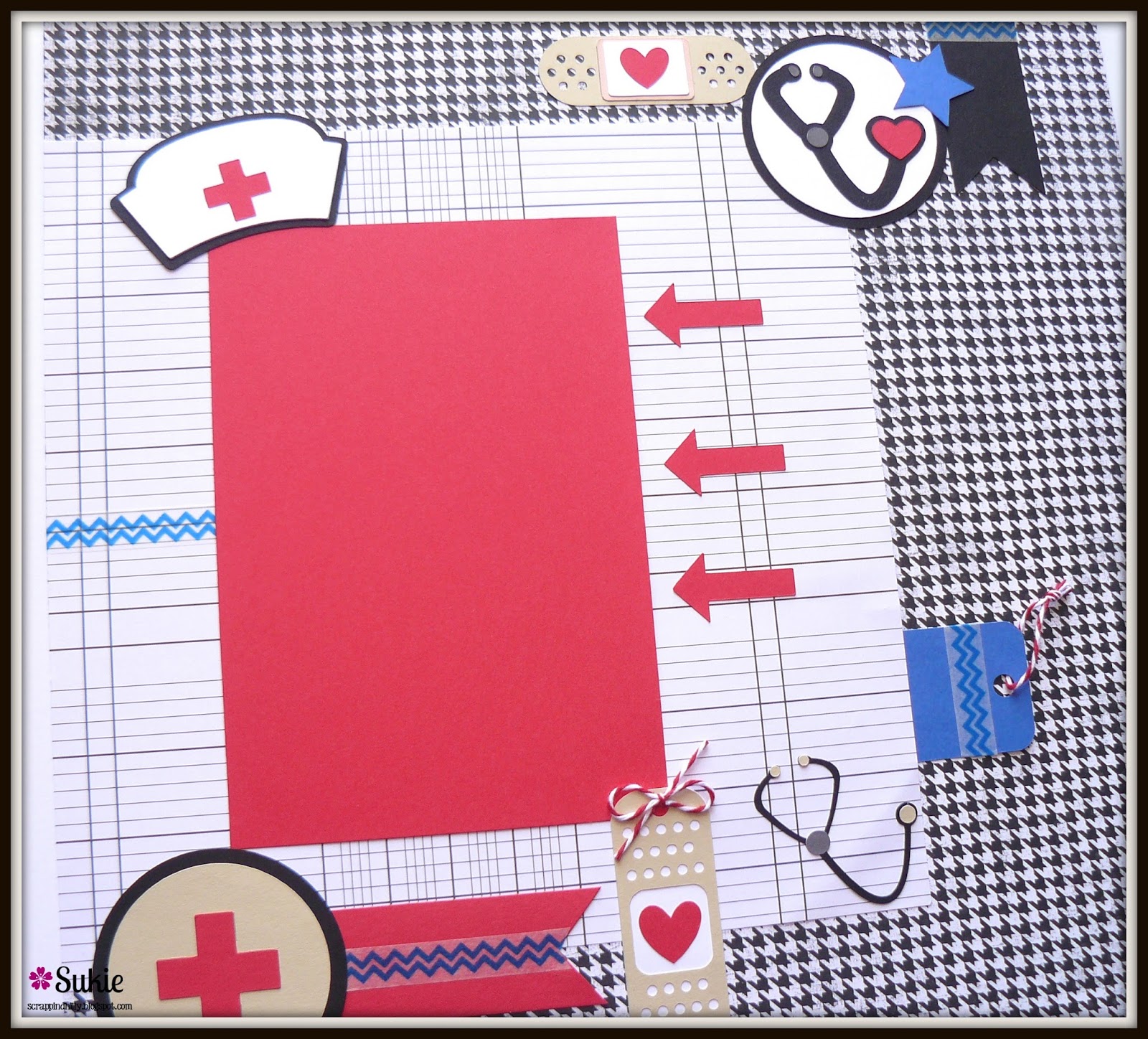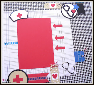 I started my layout page with the black and white paper from the DCWV Dots, Stripes, Plaids Stack and layered it with the legend paper which I found in my stash. Most of the die cuts are from the Dr. Checkup cartridge, however, I did use a few other cartridges.