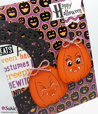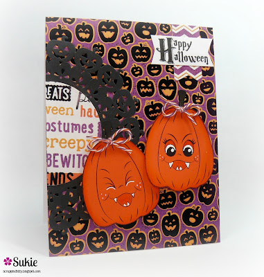 I am so excited to be sharing a Halloween card created with some new Peachy Keen Stamps. As my crafty friends know I love my Peachy Keen Stamps and am always up for the opportunity to play with them. The first pumpkin is from the new Itchy Stitchy Face Assortment and the second one is from the Funny Fangs Assortment. How cute are these faces with their adorable fangs!