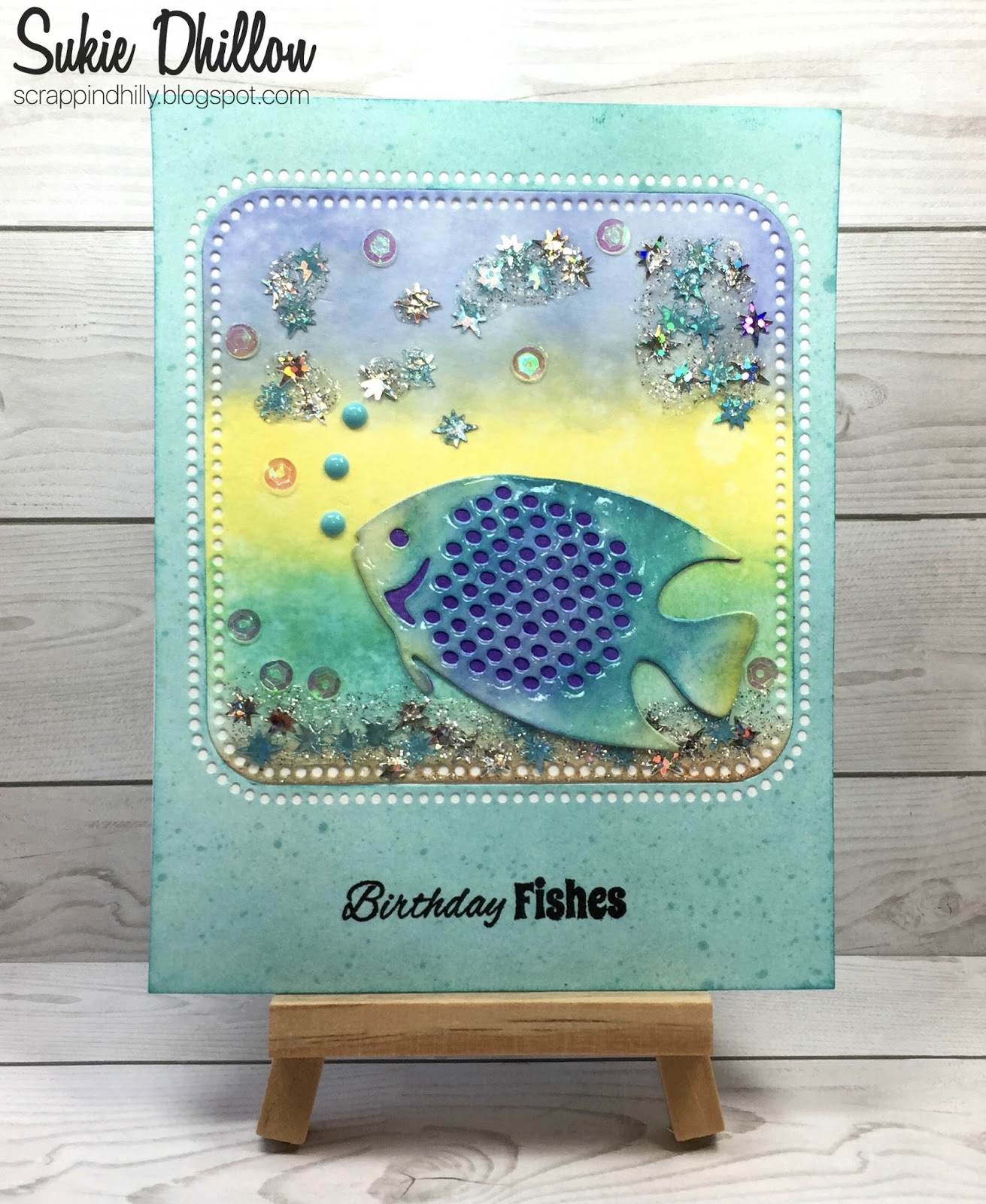 The background of my card was created with a mixture of distress inks. I used some glossy accents mixed in with sequins for a sparkly affect. The fish was also inked up and covered in Glossy Accents. A few GMD enamel dots from the Nautical Ocean Colors were added to my card. The finishing touch was a sentiment from the Scrappy Moms Little Critters (retired) stamp set.
