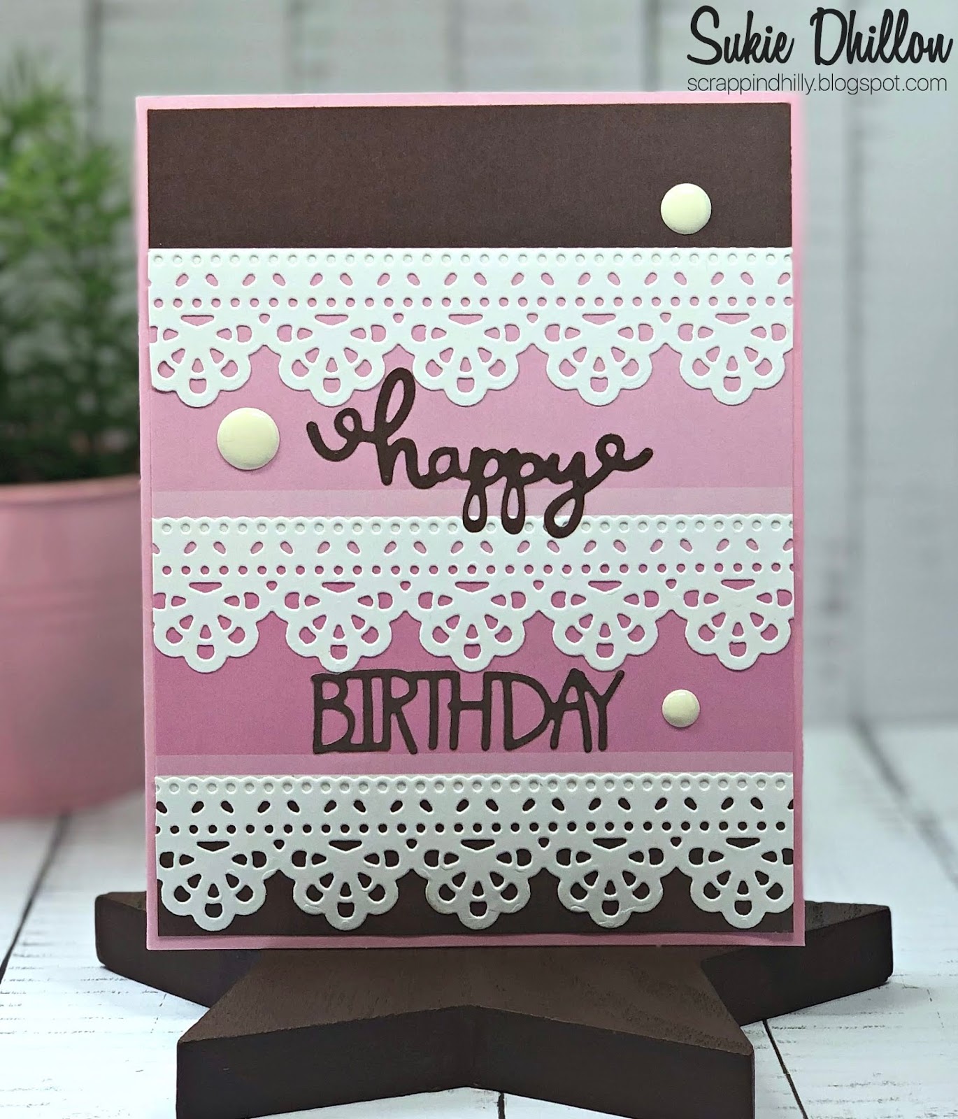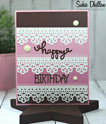 This card is so elegant and I love that dainty lace die! Pink and brown always is such a pretty color combo.
