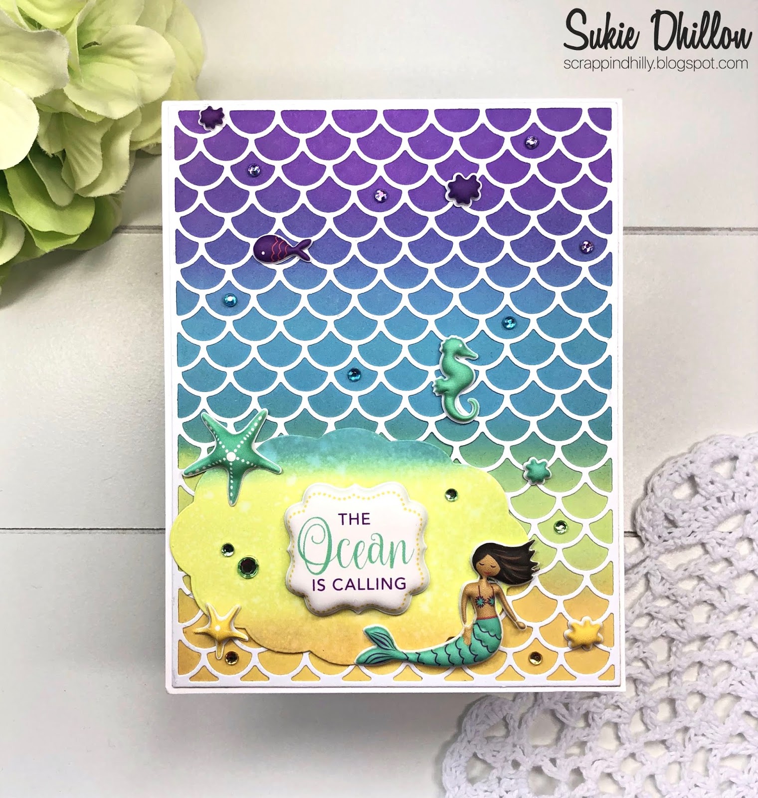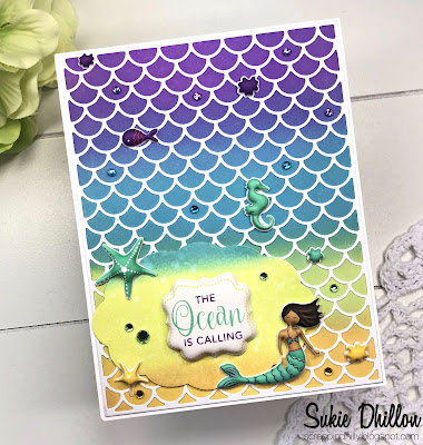 I created the background panel with a combination of Distress Oxide Inks and layered it with the Mermaid Scale Mat. The white card stock created a stark contrast between the layers. Next I cut an a oval with the Momenta Nested Oval Border, inked it and layered it on top. The mermaid stickers and some bling was scattered on my card base to finish it off.