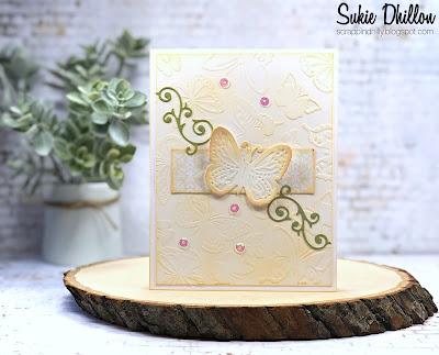 This is so gorgeous, Sukie!! I love the embossed background and the pretty butterfly and flourishes!! Have a great day!! Big hugs :)