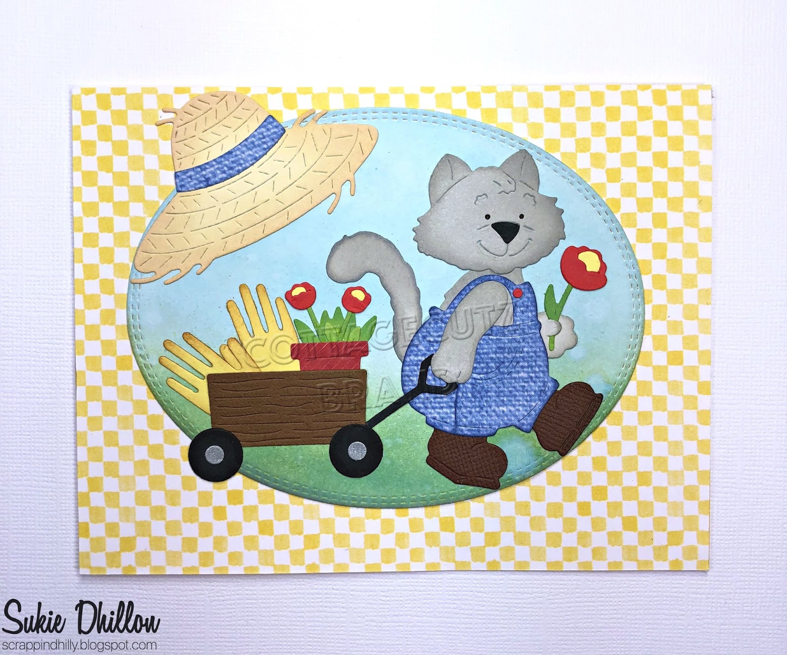I created my card base by layering the pieces together and adding a stamped sentiment to the punched border. The garden cart was centered inside the oval and adhered on my card.